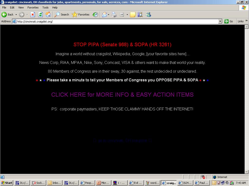 Believe it or not, Monster Cable (remember “Monster Park”?) considers craigslist a “rogue site” for blacklisting and takedown under PIPA – apparently 2nd hand sales of stereo cables by CL users is reducing Monster’s sales of new cables. (reddit).