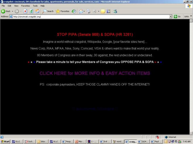 Sen Darrell Issa (R-CA) and Rep Ron Wyden (D-OR) are championing an alternative to SOPA/PIPA called Online Protection and Enforcement of Digital Trade Act (OPEN) that addresses foreign sites dedicated to piracy, without disrupting basic Internet protocols, or threatening mainstream US sites like craigslist.