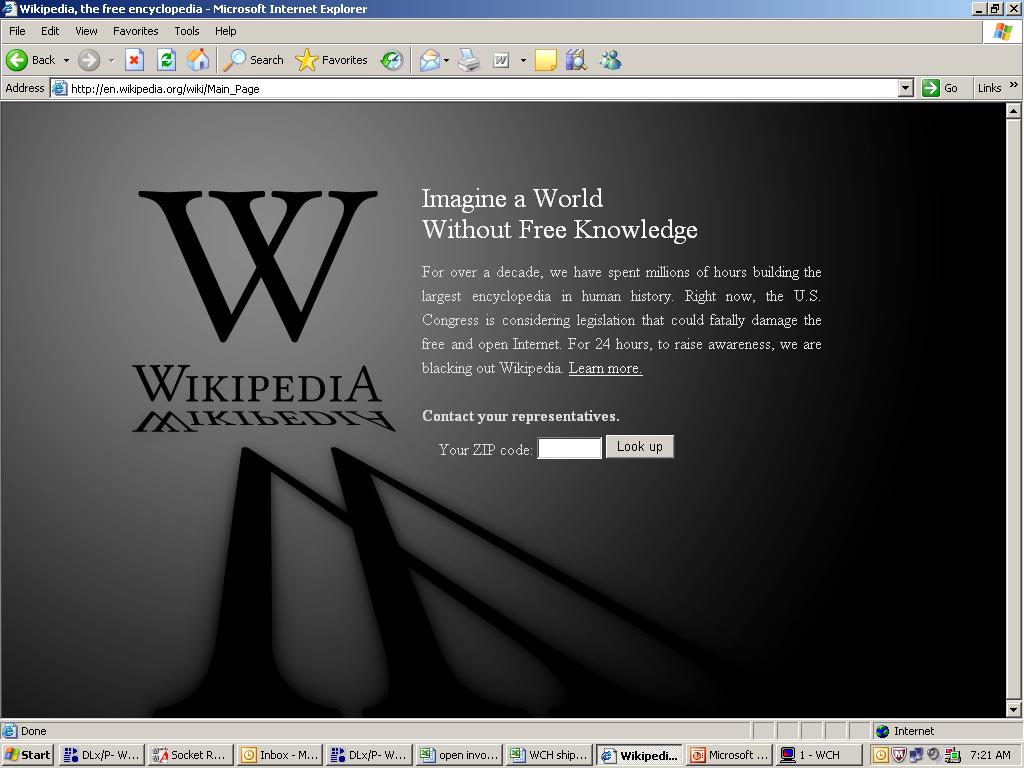 Tomorrow wikipedia will be blacked out, we will not be able to access their articles and we will not be able to use this great resource for unbias encyclopedia for everything from history to current events, and from science to mathematics.