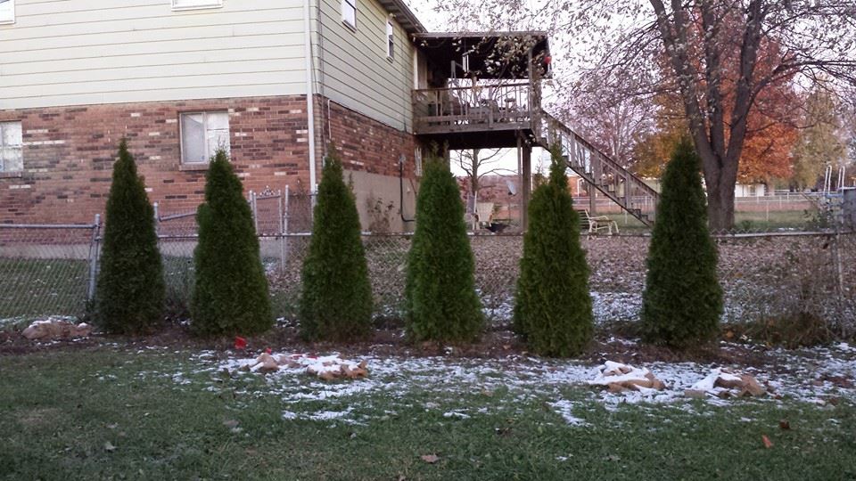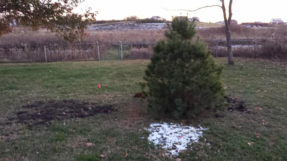 On Sunday, we returned to the tree farm and placed an order for nine trees, including six arborvitaes, two white pines, and a fat albert. Since they were already booked, they couldn’t deliver them that day, but promised to deliver first thing the next day. They gave us some little flags to place in the yard, and told us they would place the trees by them. Sure enough the next day when I was on break at work, my wife had sent me a text message to say they had arrived right before she left for work, and that the trees looked fantastic. I checked the weather and saw that the weather was going to plummet that night and snow was forecast. I stayed late anyway, completing additional projects, and got home right as it got dark. Having thought ahead the day before, I had pre-dug the holes for the trees where the flags were placed.
