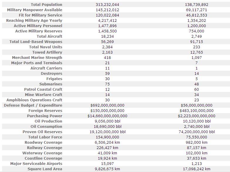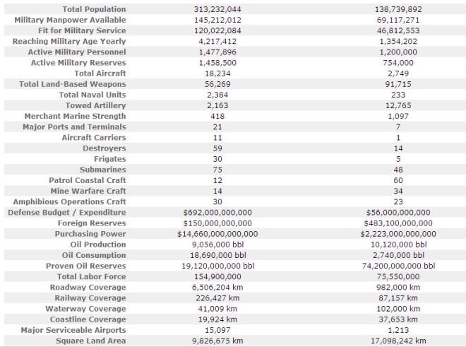 For some facts and figures on oil production, usage and firepower from all the worlds leading countries. Go to www.globalfirepower.com where you can even compare countries head to head.